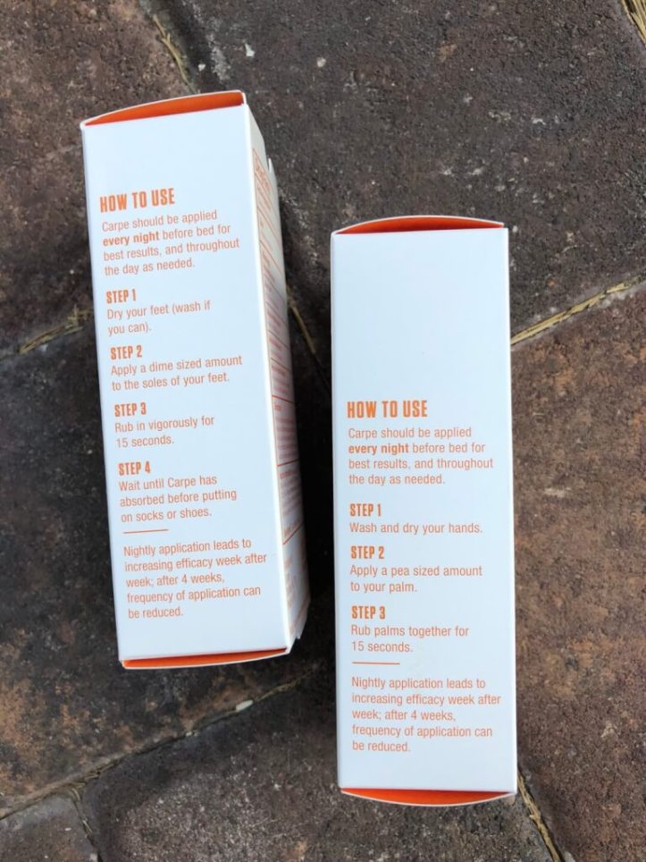 The product is recommended for daily application and it says on their website that some people see effectiveness immediately, some need time for multiple applications to build up and help. The recommendation is that Carpe lotion is applied at night (usually sweat glands are not as active at night; unless you’re menopausal/perimenopausal and have night sweats on occasion… then your sweat glands just seem to go nuts). For people with lots of issues with hyperhidrosis, an application may need to be done 3 times a day for about 4 weeks, then after that frequency can be reduced.