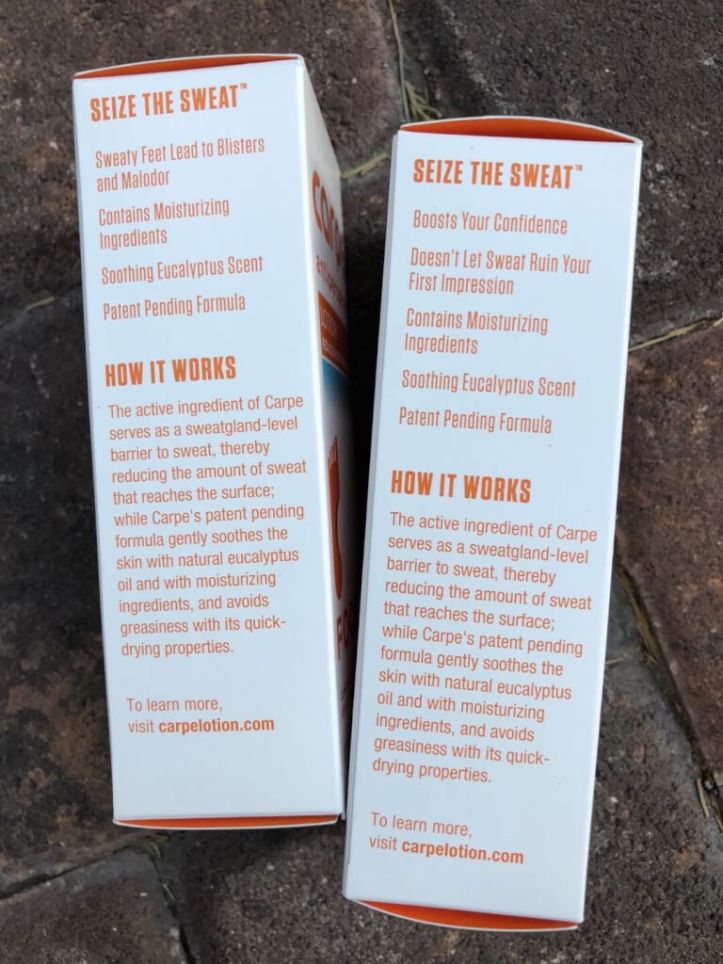 I got an email with the subject line of “Weird Review Product” a while ago and when I opened it up it said, “This is kind of weird, but I have a product I thought might be up your alley. It’s called Carpe, and it’s an antiperspirant lotion for hands and feet. I thought your audience might get a kick out of it – especially after seeing your SweatBlock post.”