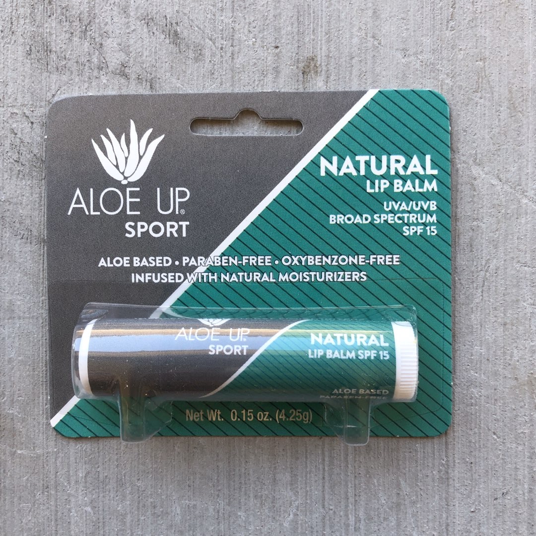 Aloe Up Sport natural lip balm: This is lip balm, with sunblock. It’s not strongly scented or anything like that. Evidently the company does make this in other flavors/scents/whatever. It doesn’t contain parabens.