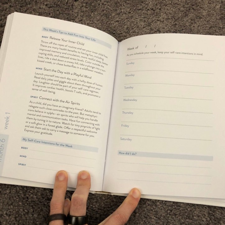 But I was sent this beautiful little hardback journal, The Self-Care Planner, and it plots out ways to help you figure out how to incorporate it into your life. It’s a help book/journal, as most of the pages contain space for you to enter in your own writing.